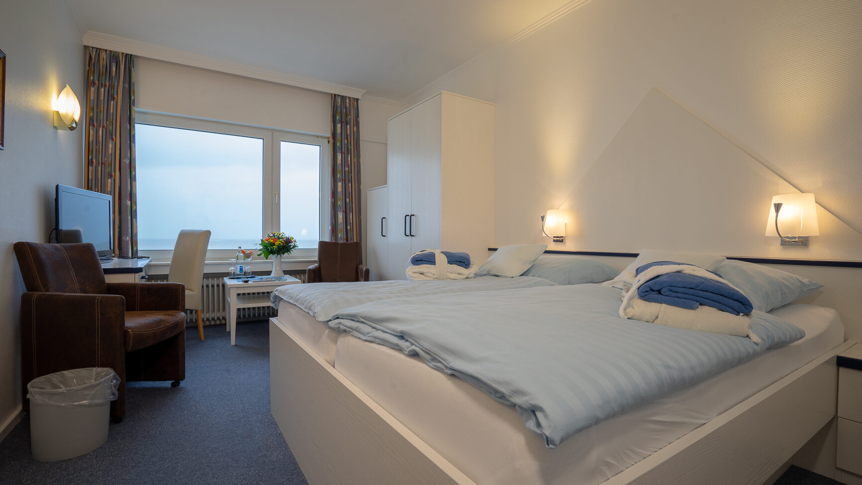 Es stehen Ihnen 51 Doppelzimmer und 21 Einzelzimmer unterschiedlicher Größe zur Verfügung. Knapp die Hälfte der Zimmer bieten einen tollen Blick auf den Strand und die Nordsee Norderney ´s.