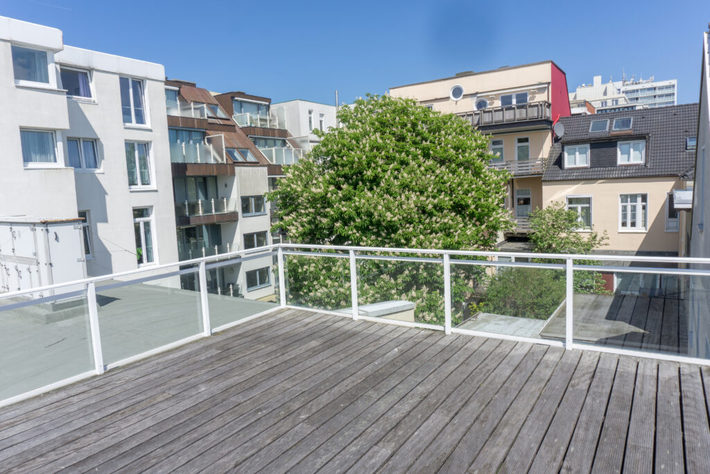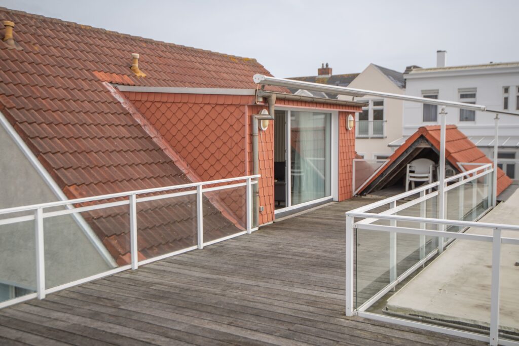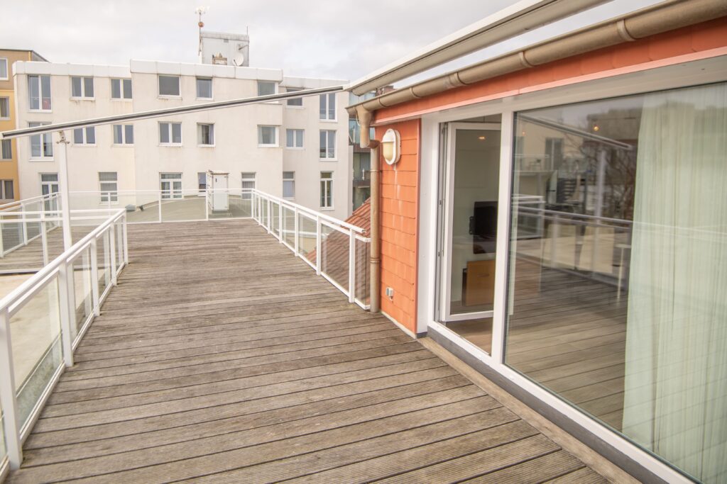 Das Highlight der Wohnung ist die beeindruckende 60qm große Dachterrasse. Hier finden große und kleine Gäste ihren Lieblingsplatz: beim Sonnenbaden, Lesen, Spielen oder beim gemeinsamen Abendessen unter freien Himmel.