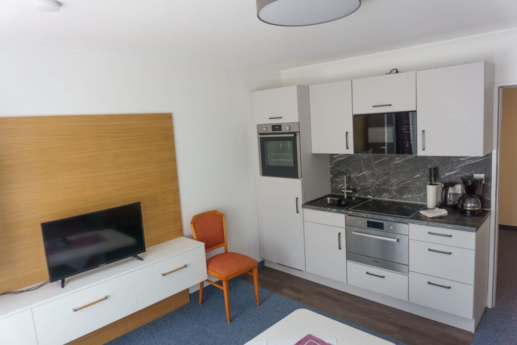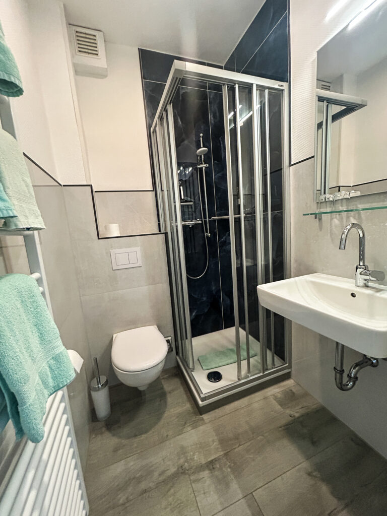 Unsere Wohnungen liegen ruhig zum Innenhof – perfekt für alle, die Entspannung und Erholung suchen. Nach einem langen Strandspaziergang lädt das moderne Badezimmer mit komfortabler Dusche zum Erfrischen ein, während die abgetrennte Küche mit stilvollem Design und kompletter Ausstattung Freude am Kochen weckt. Ob ein schneller Kaffee am Morgen oder ein gemütliches Abendessen – hier genießen Sie Unabhängigkeit und Komfort.