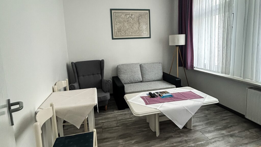 Der Wohnbereich mit bequemer Couch und liebevollen Details lädt zum Entspannen ein – ob nach einem Spaziergang am Meer oder einem Bummel durch die Gassen Norderneys. Genießen Sie das harmonische Zusammenspiel von Komfort, Ruhe und nordischem Charme. Auch das Schlafzimmer bietet für Sie ein Rückzugsort zum lesen, entspannen oder schlafen. Das Badezimmer bietet Ihnen eine Dusche und ist mit Handtüchern Föhn Handseife und Duschgel ausgestattet